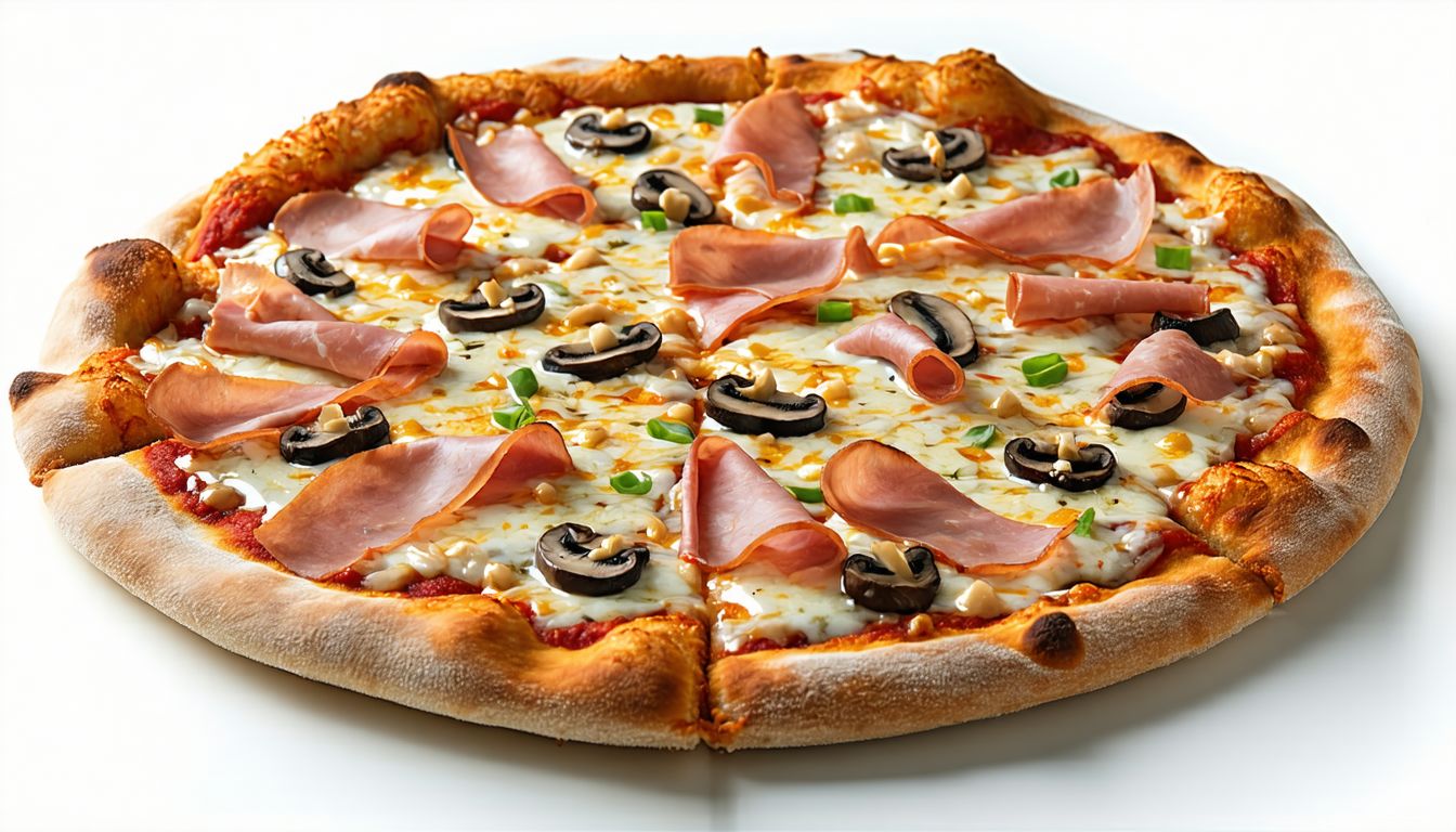 Sauce tomate, fromage, crème, jambon, champignons, emmental, viande hachée