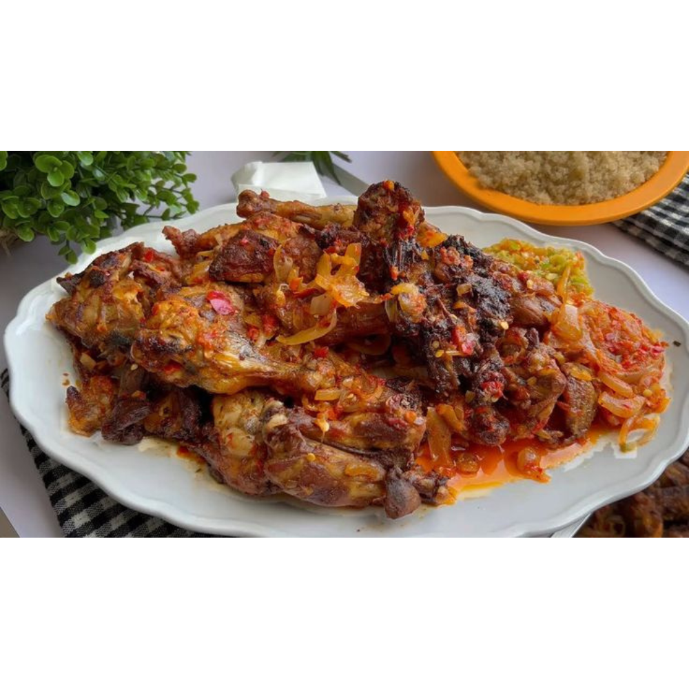 Plat de poulet cuit à feu vif et accompagné d'une sauce piquante avec un accompagnement au choix