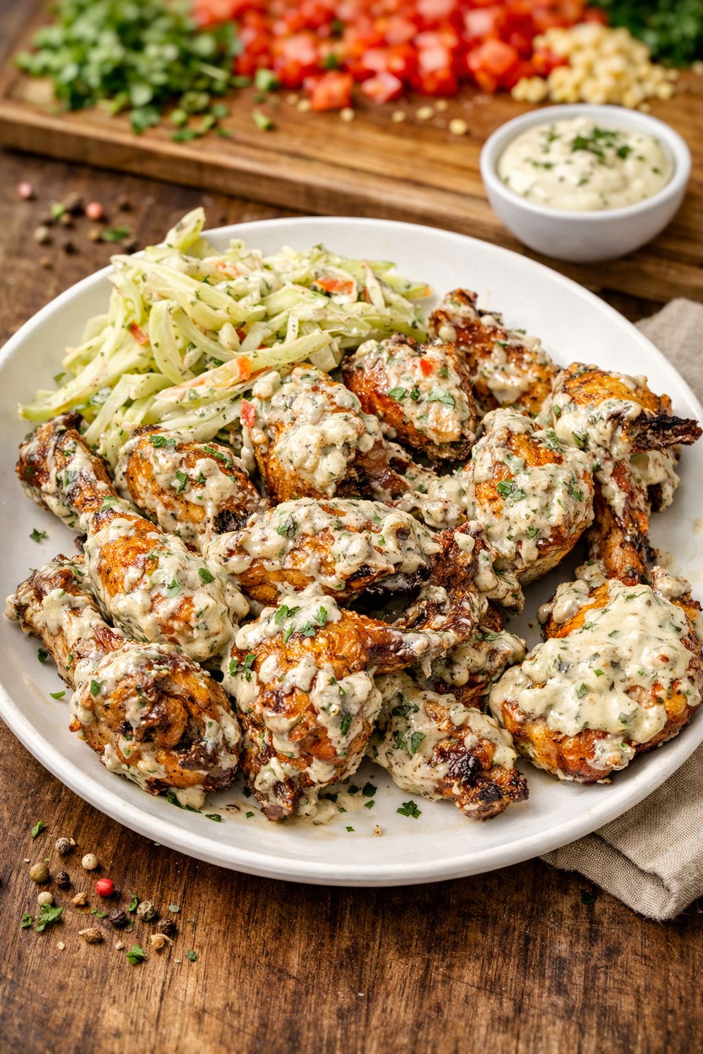 Délicieux plat de poulet entier et bien charnu, mariné avec sauce verte et servi avec de l'attiéké en accompagnement