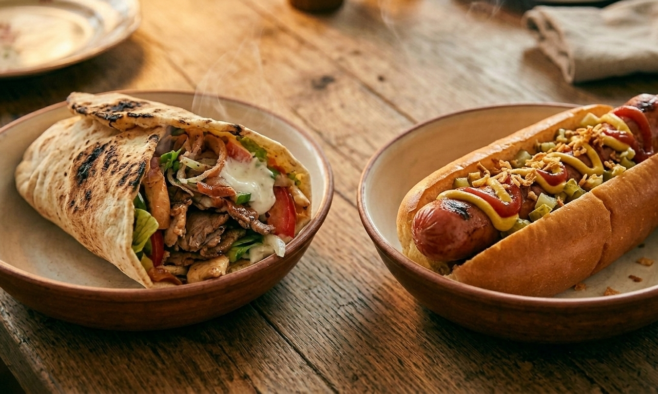 Лаваш(піта),огірок солоний,картопля,фірмовий часниковий соус, сосиска мисливська ,тостовий сир, морква, кетчуп…