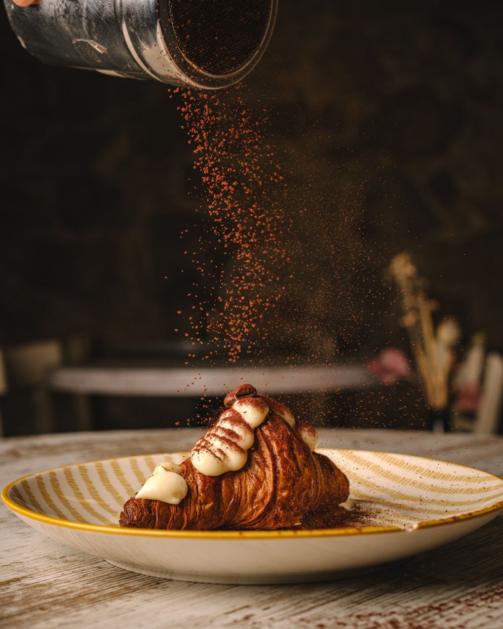 Croissant relleno de mascarpone Acabado con mascarpone, granos de café y cacao