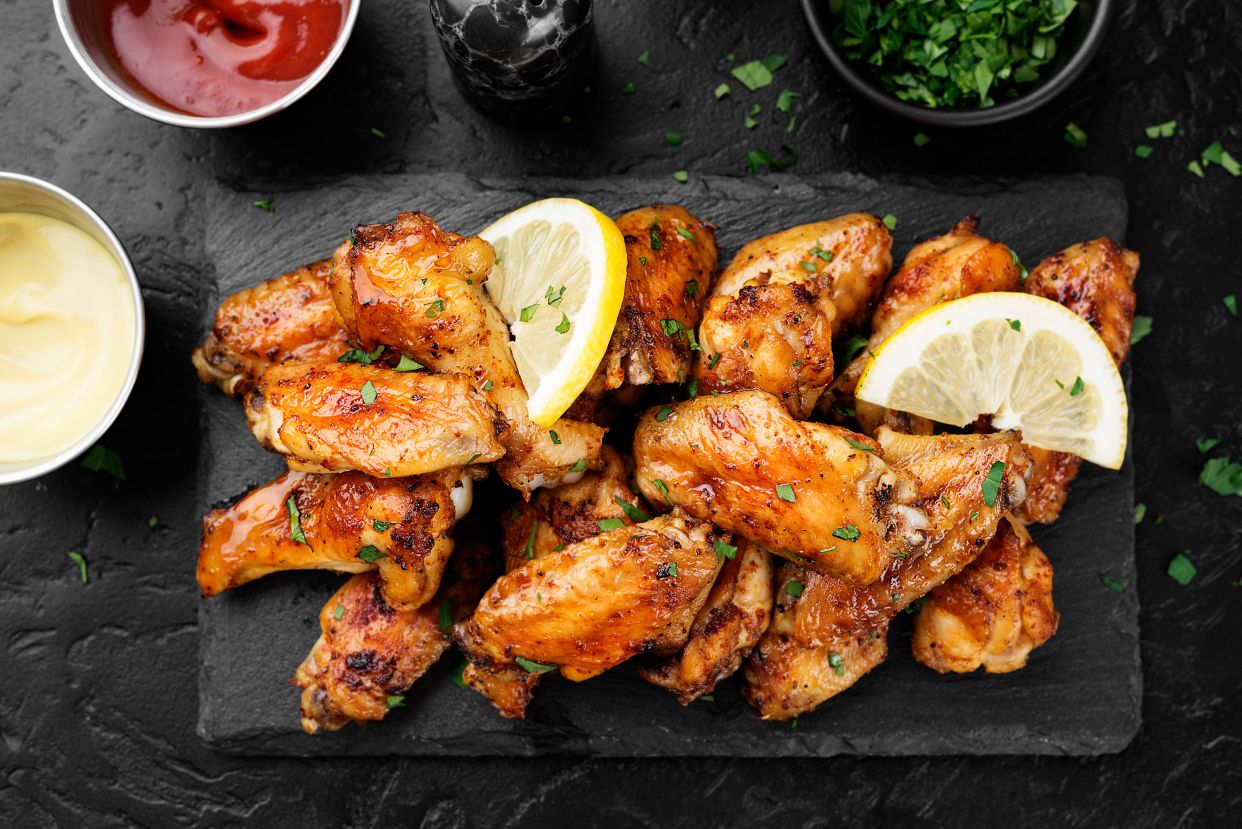 Alette di pollo al forno in salsa ceviche e patatine fritte