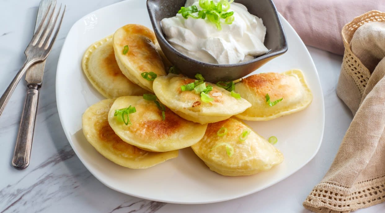 (kapusta z grzybami, mięsne, ruskie), okrasa z boczku z cebulką