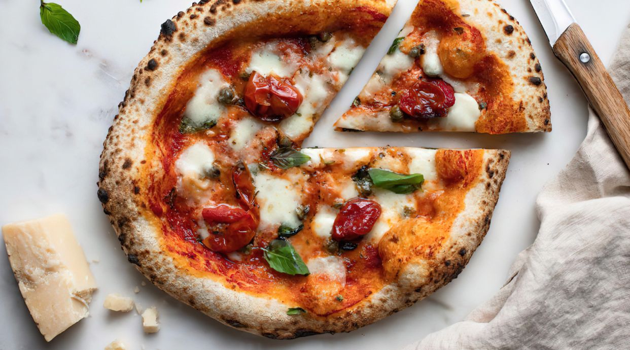 Sos pomidorowy pelati, mozzarella fior di latte, grillowana pierś z kurczaka, papryka marynowana w oliwie z oliwek Pelati tomato sauce, fior di latte mozzarella, grilled chicken breast, peppers marinated in olive oil
