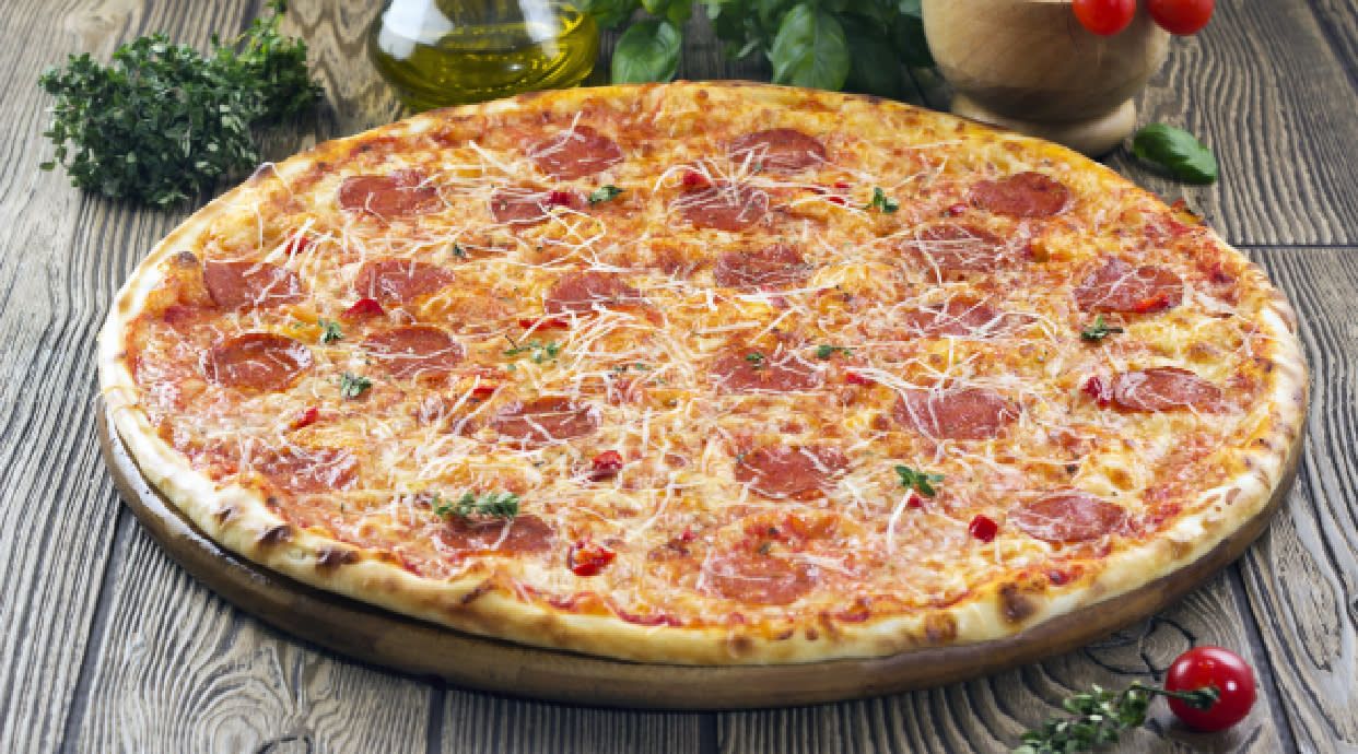 Tomate, mozarela, frango tikka, fiambre, cogumelos, cebola, pimento, orégãos