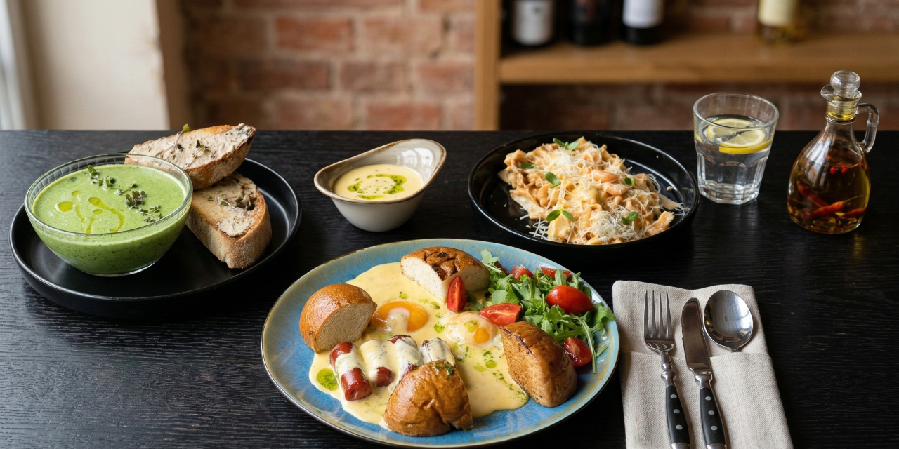 Шпинатний крем-суп з лососем та брускетами та сиром Горгонзола (300г)