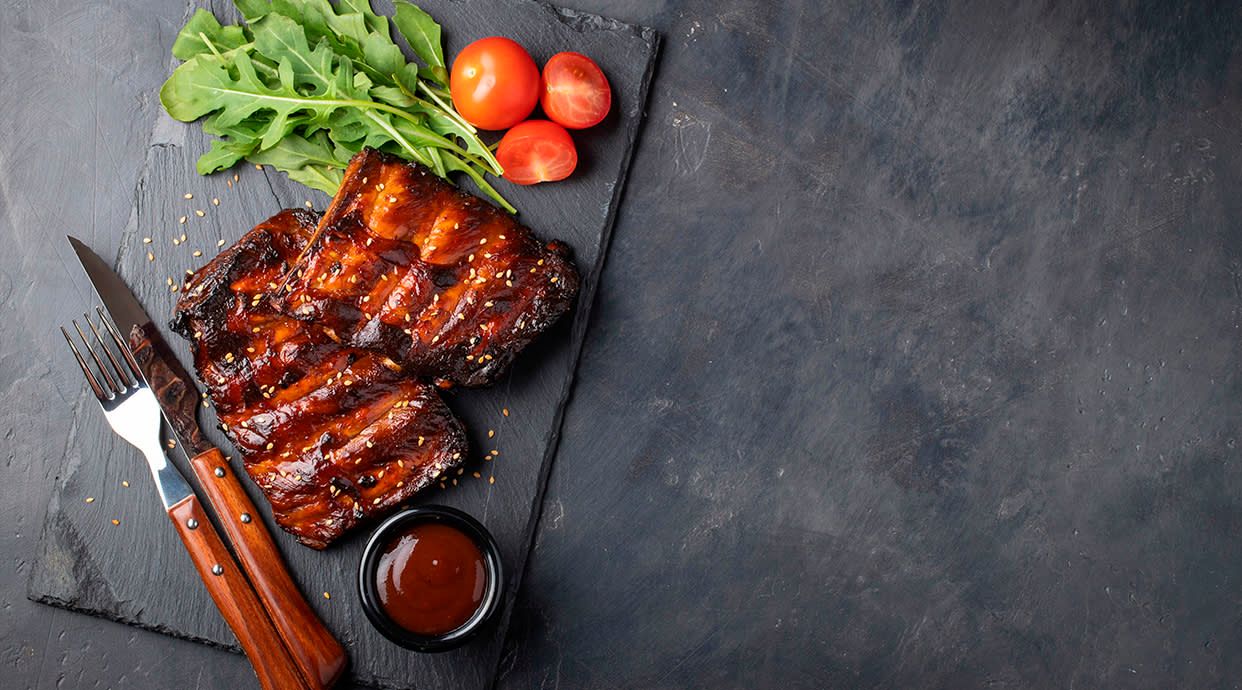 Cвинячі реберця готуються в Смокері впродовж 6 годин, а потім томляться при температурі 60-80 градусів. Реберця натираються лише сухим маринадом з натуральних спецій - техаською сумішшю