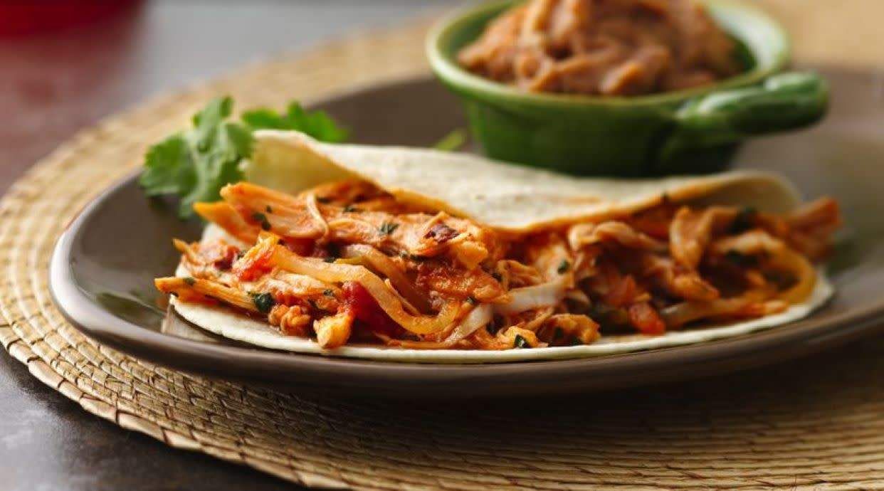 2 tortillas de maíz, carne de cerdo cocinado a baja temperatura, acompañado de cebolla y cilantro.