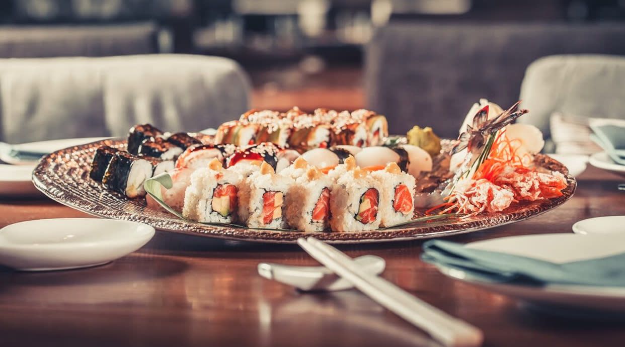 Flamed maguro: uramaki de atún rojo flambeado, langostino en tempura, aguacate y espárrago triguero con barbacoa japonesa y salsa ahumada spicy