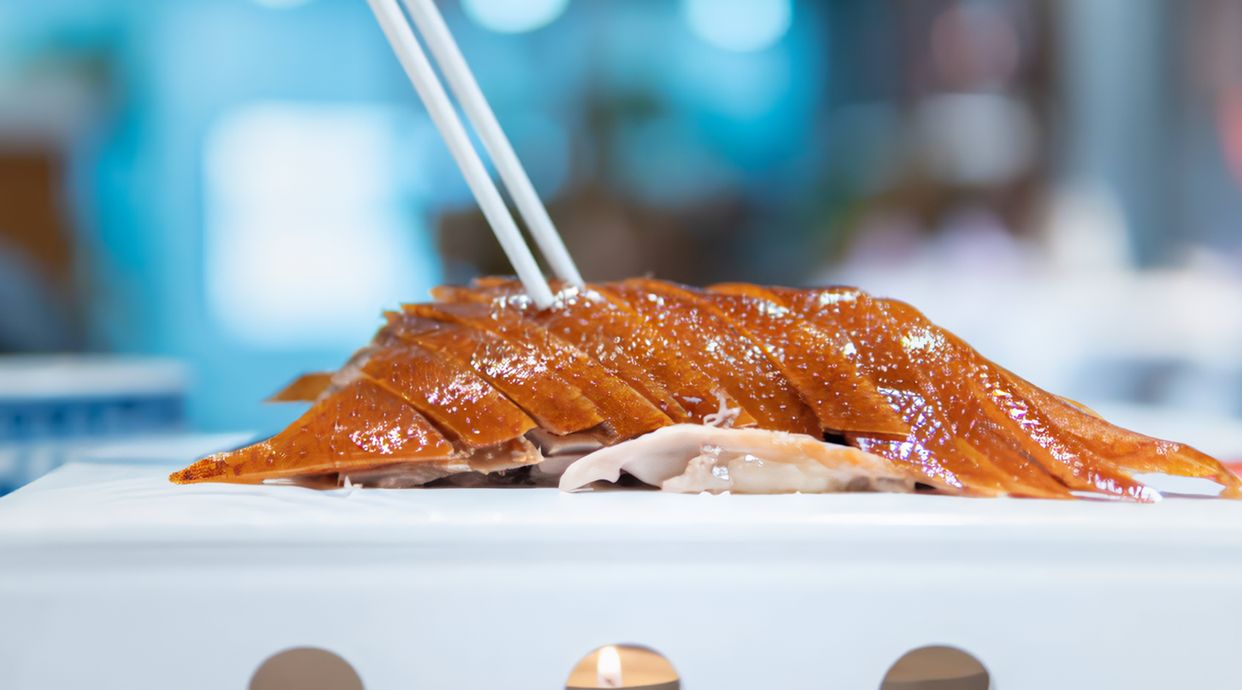 Pato laqueado entero en dos servicios (rollitos + caldo)