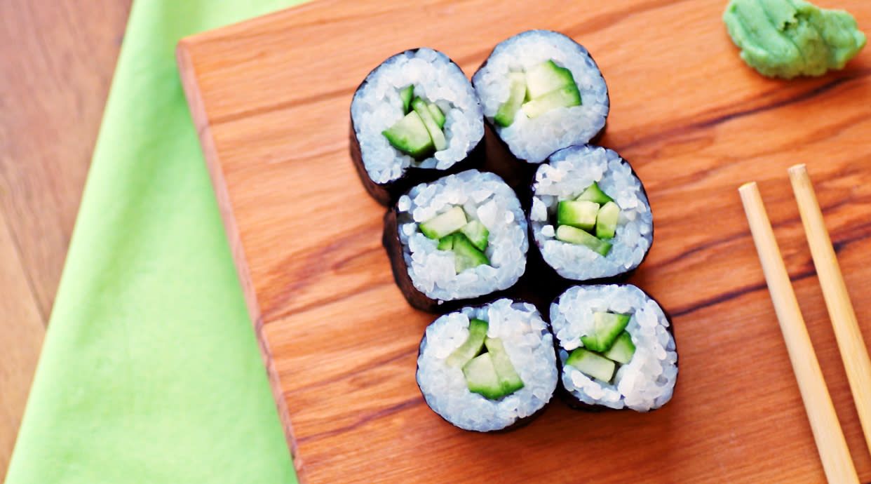 Futomaki de tomate deshidratado, pepino, aguacate, zanahoria y mayo picante