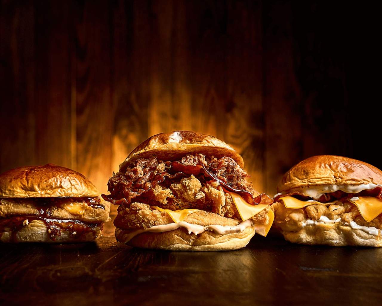 Hamburguesa de Pechuga 100% de pollo rebozado con queso cheddar, bacon, cebolla frita crujiente y nuestra mayonesa de barbacoa ahumada, servida en pan potato roll. (No incluye patatas)