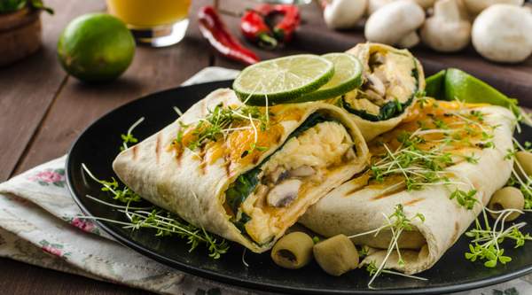 Burrito con huevos revueltos, bacon, queso y espinacas