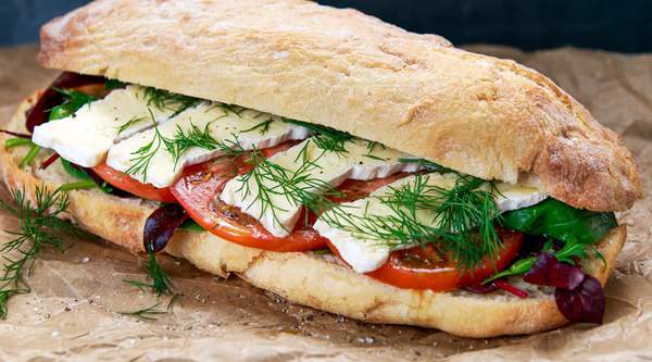 Pan de semillas con queso tierno, tomate cherry y albahaca