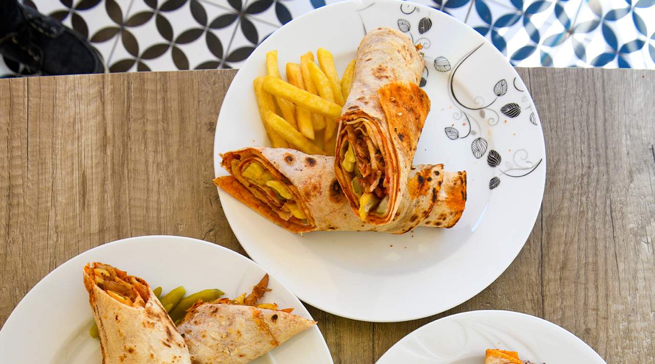 Durum vegetal, falafel o queso, lechuga, tomate y cebolla