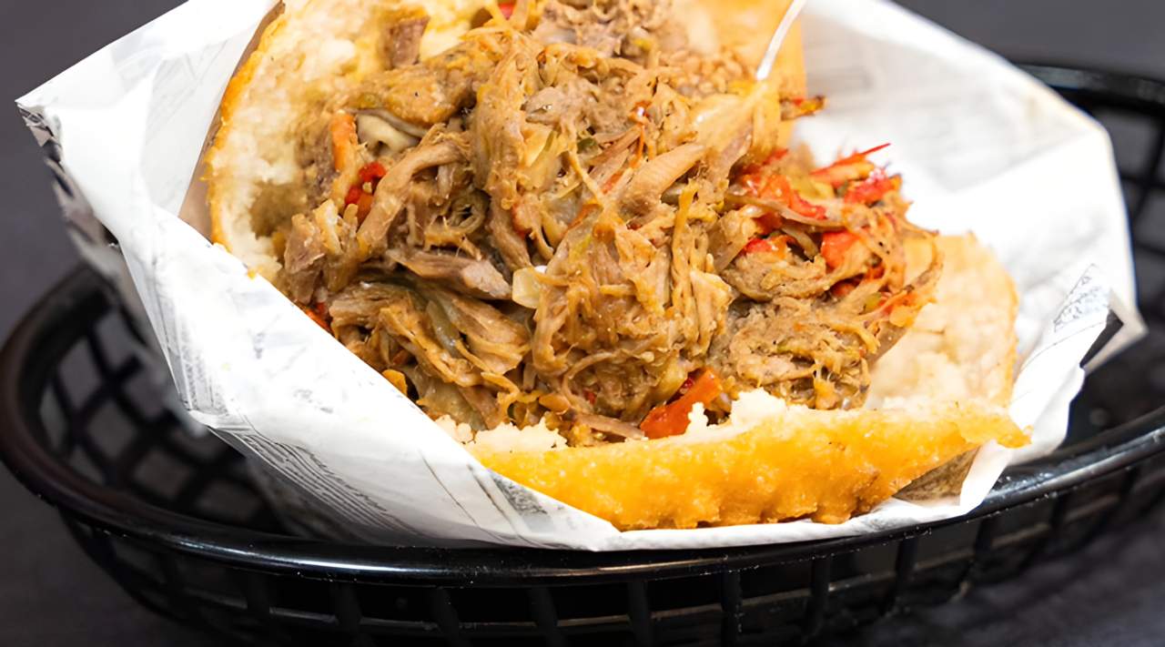 Pepito al estilo venezolano en pan tierno con filetes de cerdo y pollo con beacon lechuga , queso , aguacate y salsas