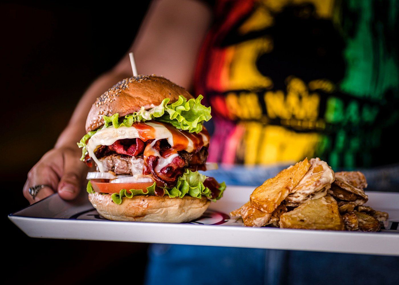 Repleto de sabor e com tudo dentro. Um hambúrguer suculento com jalapeños picantes, bacon crocante, queijo cheddar derretido e alface, coberto com nosso molho secreto e molho barbecue defumado.