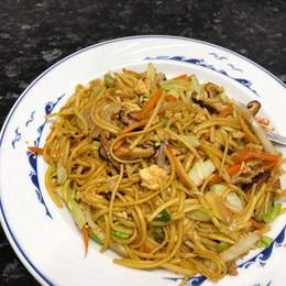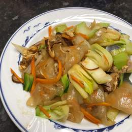 Pasta de arroz salteada con cangrejo chino, huevo, verduras y setas.