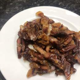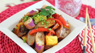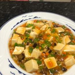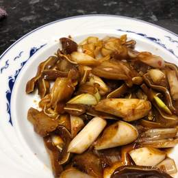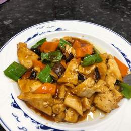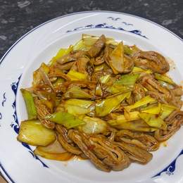 Empanadillas hechas con harina de fécula de patata, rellenas de carne de cerdo, zanahoria, nabo y setas chinas. Salteadas con carne, huevo, verduras y setas chinas