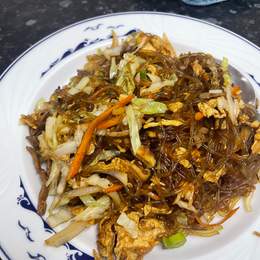 Tallarines de harina de fécula de patata salteados con carne, huevo, verduras y setas. (Se puede hacer sin carne y/o sin huevo)