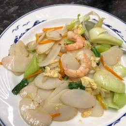 Pasta de arroz salteada con gambas, huevo, verduras y setas.