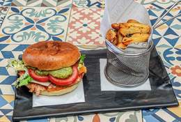de ternera con queso gouda, cebolla caramelizada, salsa tártara, tomate de Muchamiel, mézclum y patata guarnición con salsa ranchera.