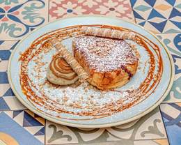 con helado de leche merengada y toque de almendra crocanti y dulce de leche.