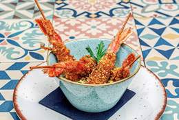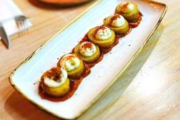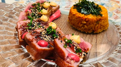 con emulsión de remolacha y contraste de guacamole (aguacate de la Comunidad Valenciana), mayonesa japonesa, mango y cremoso de wasabi y picante.