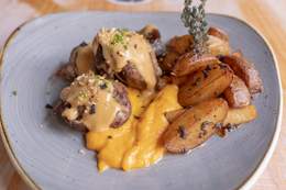 con parmentier de patata al pimentón de La Vera y pisto manchego.