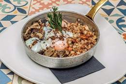 con boletus salteados, migas crujientes y aceite de trufa negra.