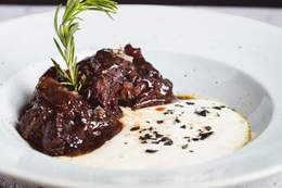 cocinada a 85ºC con salsa de vino tinto y parmentier de patata.
