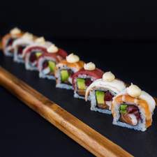 Rollo de salmón, aguacate y queso crema con salsa de sésamo. /8udsOpción asado: Wakame, salsa de sésamo, sweet chilly, aceite trufado y cebolla crujiente