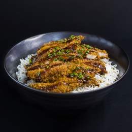 Pollo, cerdo o salmón empanados con panko y salsa bbq japonesa acompañado de arroz basmati o de sushi