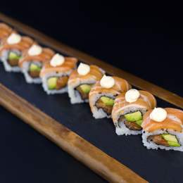 Rollo de salmón, aguacate y queso crema con salsa de sésamo. /8udsOpción asado: Wakame, salsa de sésamo, sweet chilly, aceite trufado y cebolla crujiente