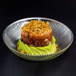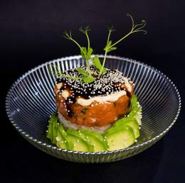 Timbal de salmón picado sobre base de arroz de sushi y cercado por aguacate con mayonesa japonesa, teriyaki y bolitas de arroz crujiente