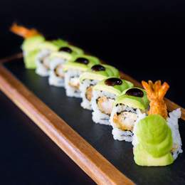 Rollo de langostino rebozado en panko con queso crema coronado con aguacate, teriyaki y cebollino /8uds