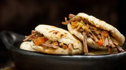 Arepa con Carne Mechada (carne de ternera mechada, tomate, cebolla y pimiento ají dulce).