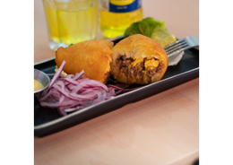 Patata rellena de guiso de ternera, huevo cocido y pasas sultanas acompañado de salsa de ají amarillo y salsa criolla.