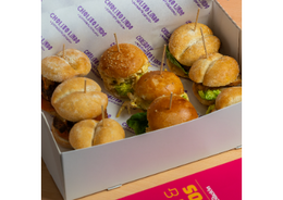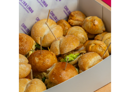 Pan de hamburguesa relleno de cogollos,pechuga de pollo desmenuzada en mayonesa de apio ,tomate rama& patatas al hilo.