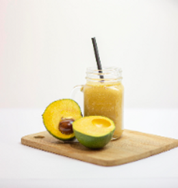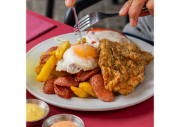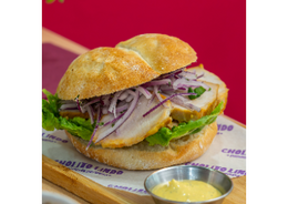 Pan francés de horno a leña, panceta de cerdo deshuesada crujiente (250 g.), boniato frito y salsa criolla de la casa, acompañado de uchucuta de ají amarillo y crema de rocoto.