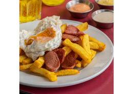 Abundante patatas fritas con Frankfurt y su sabroso trozos de pollo crujiente.