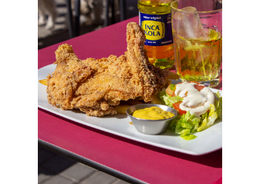 Cuarto de pollo crujiente acompañado de patatas fritas, ensalada y salsas.