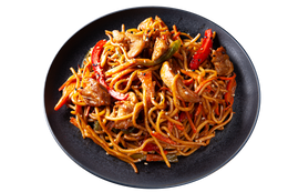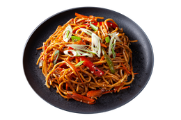 Fideos salteados con verduritas, habas de soja, sésamo y cebollino.