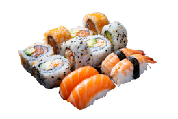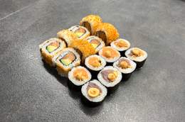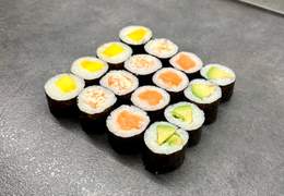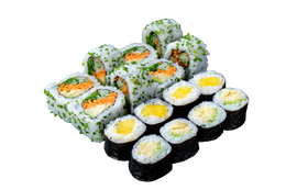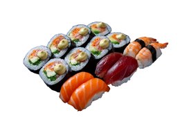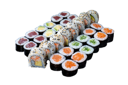 8 makis de salmón, 8 makis de atún, 4 makis de aguacate, 4 makis de pepino y 8 california uramaki.