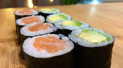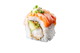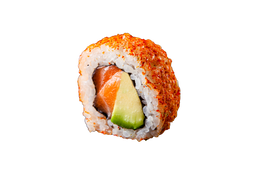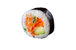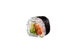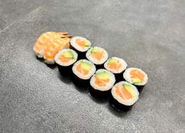 Delgado rollo de sushi elaborado con nuestro arroz recién elaborado, relleno de salmón fresco y aguacate hass.