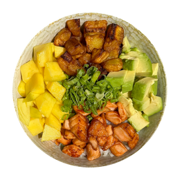 Dados de Salmón a la plancha, Aguacate, Mango, Plátano macho frito.