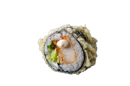 Rollito grande, relleno de gamba panko, aguacate, plátano frito, queso crema y cebollino.