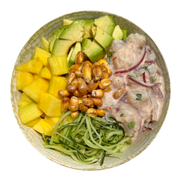 Ceviche especial de la casa, aguacate, mango, pepino, maíz tostado y salsa acevichada.