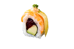 Salmón, Atún, Aguacate, Mango, Mayonesa picante y Teriyaki.