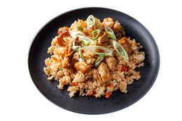Arroz de sushi, pollo frito, salsa teriyaki y sésamo